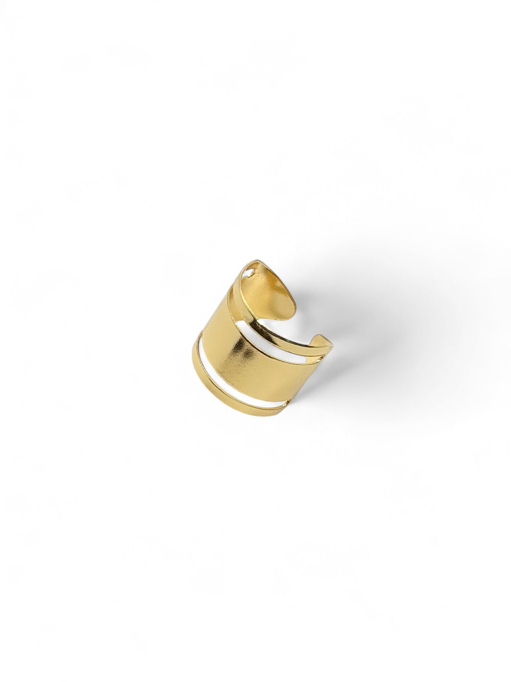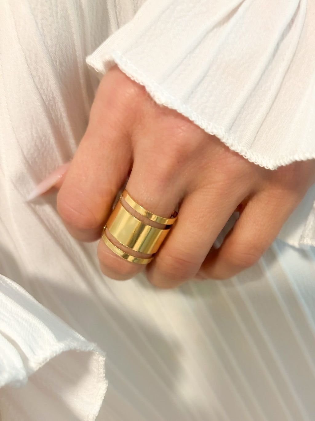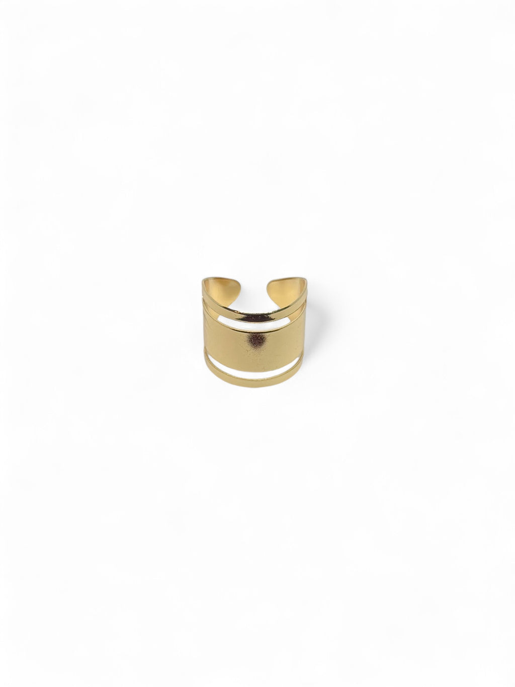 Esse anel banhado a ouro 18 quilates é uma peça imponente e cheia de estilo, destacando-se por seu design robusto e moderno. Com faixas largas e espaços vazados entre elas, o anel cria um visual marcante, ideal para quem gosta de acessórios com personalidade e presença.