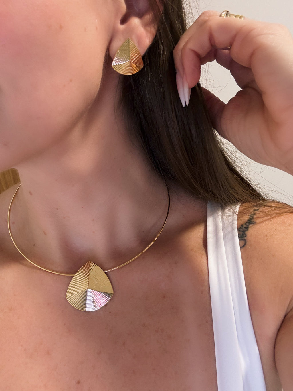 O brinco banhado a ouro 18k é uma peça de destaque que combina elegância e modernidade em um design arrojado. Com formato de pirâmide, ele apresenta linhas geométricas bem definidas, que conferem um toque contemporâneo ao acessório. O acabamento em ouro 18k garante um brilho luxuoso e duradouro, fazendo com que o brinco resplandeça à luz. Sua estrutura leve proporciona conforto ao usar, enquanto o formato ousado atrai a atenção e adiciona um elemento de estilo a qualquer look. Perfeito para ocasiões especiais ou para dar um toque chique ao dia a dia, este brinco é uma escolha ideal para quem busca originalidade e sofisticação.