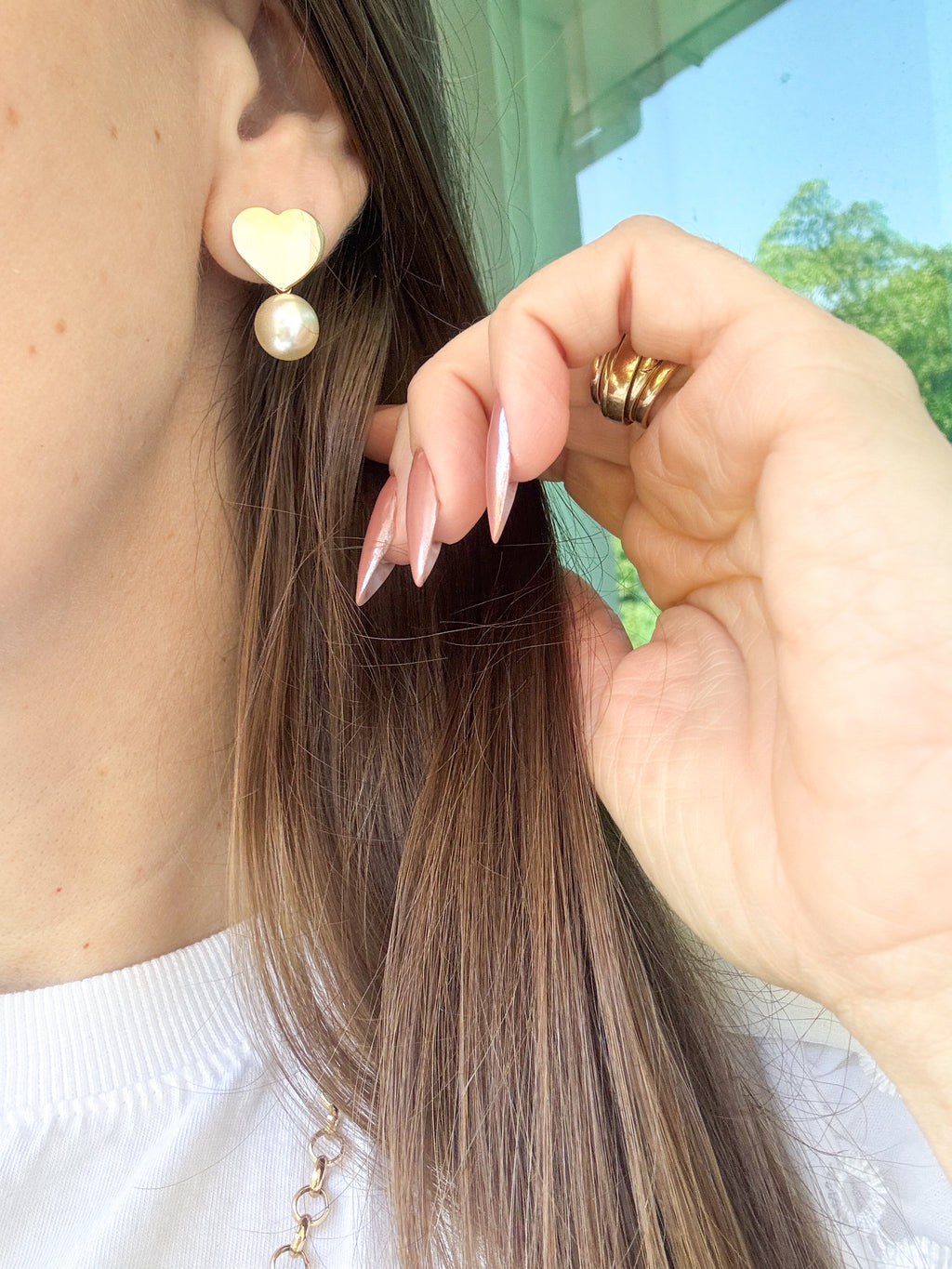 No centro do coração, uma pérola iridescente é habilmente incorporada, trazendo um toque de sofisticação e suavidade ao conjunto. A combinação do ouro 18k com a pérola cria um contraste harmonioso, resultando em uma peça que é ao mesmo tempo moderna e atemporal.