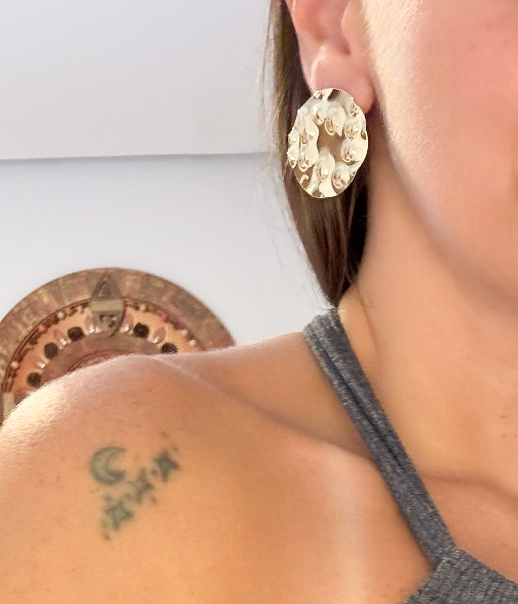 A superfície desses brincos é meticulosamente trabalhada para refletir a luz de maneira única, com áreas elevadas e rebaixadas que evocam a aparência de gotas d'água ou pequenas ondas, conferindo à peça uma sensação de movimento constante. Esse design não só adiciona um toque de ousadia, mas também exala um charme artístico que transforma qualquer look em uma expressão de estilo.
