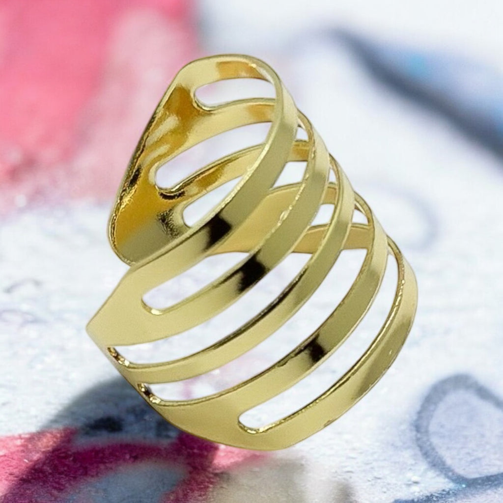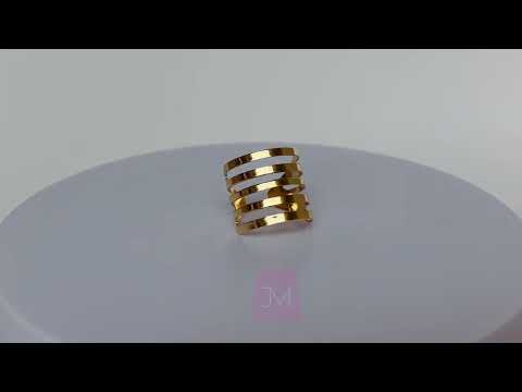 Esse anel banhado a ouro 18 quilates possui um design arrojado e moderno, com várias faixas horizontais que criam um efeito visual impactante e elegante. A estrutura aberta e vazada da peça permite que o anel seja leve e confortável, destacando-se por seu estilo contemporâneo e ousado.