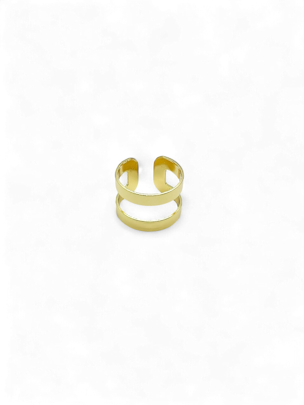 sse anel banhado a ouro 18 quilates possui um design minimalista e elegante, caracterizado por sua estrutura dupla aberta, que cria um efeito visual moderno e sofisticado. Com duas faixas paralelas, essa peça oferece uma estética clean e versátil, perfeita para quem aprecia joias com um toque contemporâneo.