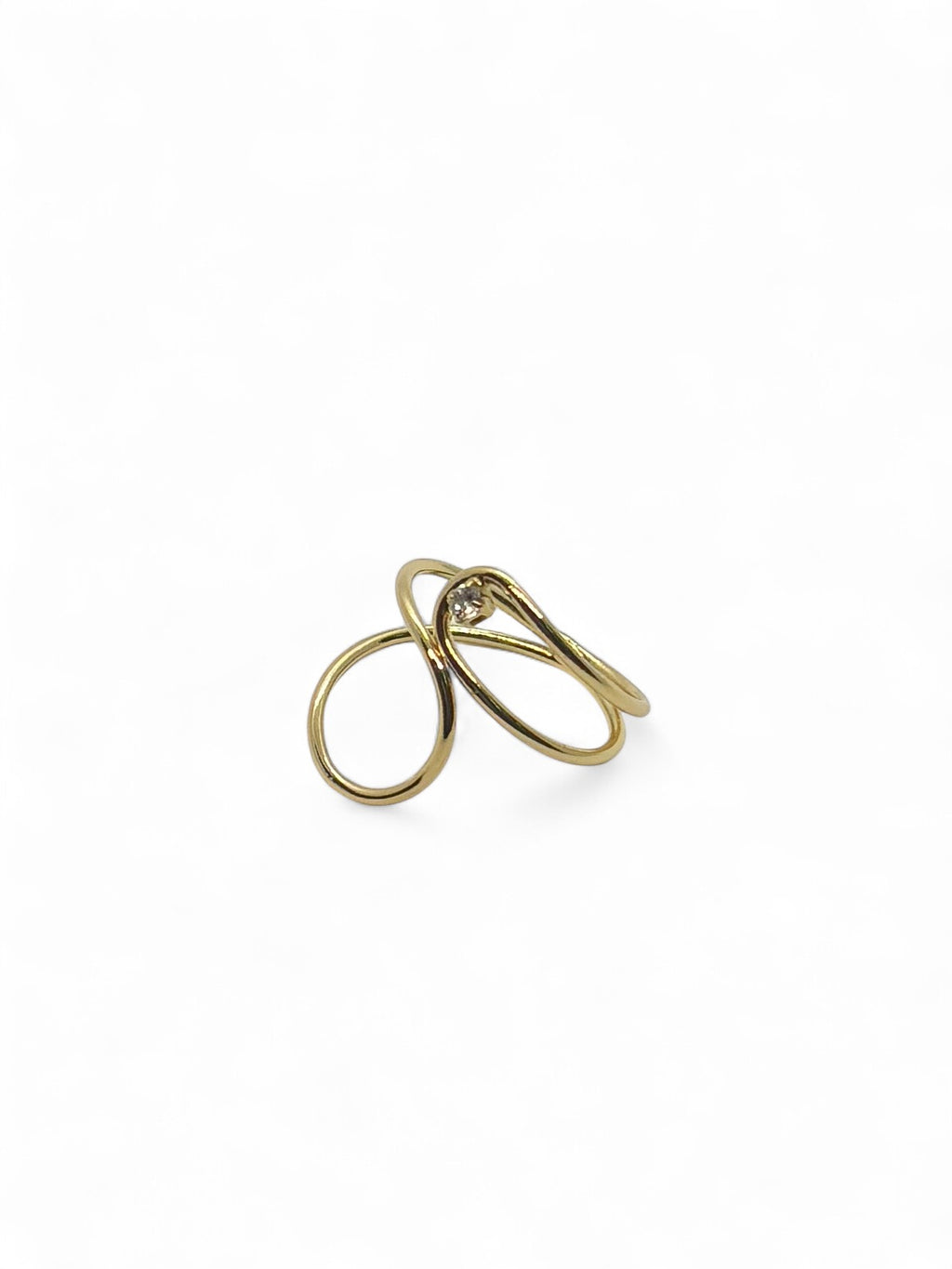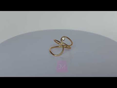 Esse anel sofisticado banhado a ouro 18 quilates é uma peça que combina modernidade e delicadeza em um design único e orgânico. Com linhas fluídas que se entrelaçam de maneira graciosa, o anel traz um charme contemporâneo e minimalista. O detalhe de um pequeno cristal no topo adiciona um toque sutil de brilho, elevando o visual com elegância.