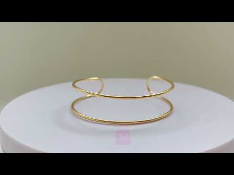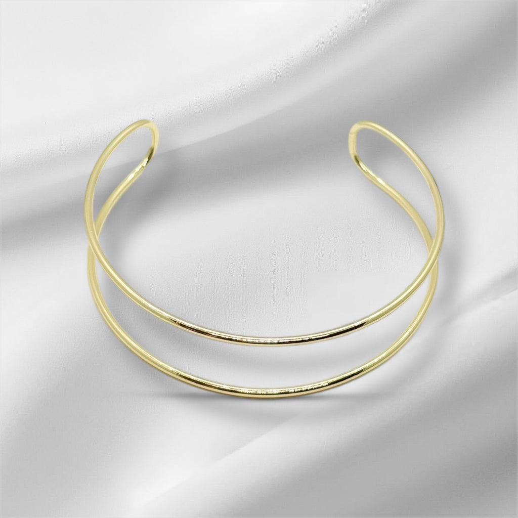 Essa elegante pulseira aberta, banhada a ouro 18 quilates, é a essência da simplicidade refinada. Com um design minimalista em duas linhas paralelas, essa peça é delicada e moderna, trazendo um toque de sofisticação ao pulso sem esforço.