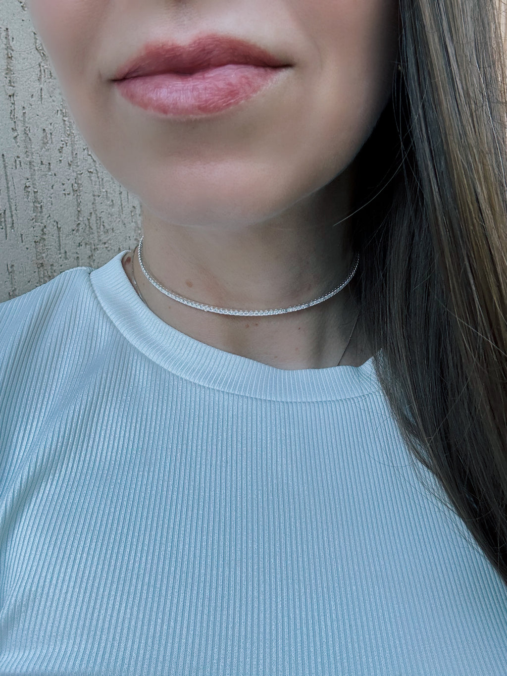 Um choker banhado a prata cravejado é uma peça de joalheria elegante e moderna. Ele é projetado para se ajustar confortavelmente ao redor do pescoço. O banho de prata confere um brilho sofisticado, enquanto os cristais ou pedras cravejados adicionam um toque de glamour e brilho. Este tipo de choker pode apresentar um design minimalista ou mais elaborado, com padrões que vão desde geométricos até florais. Ideal para combinar com looks casuais ou formais, esse acessório é uma escolha versátil que realça a beleza de quem o usa.